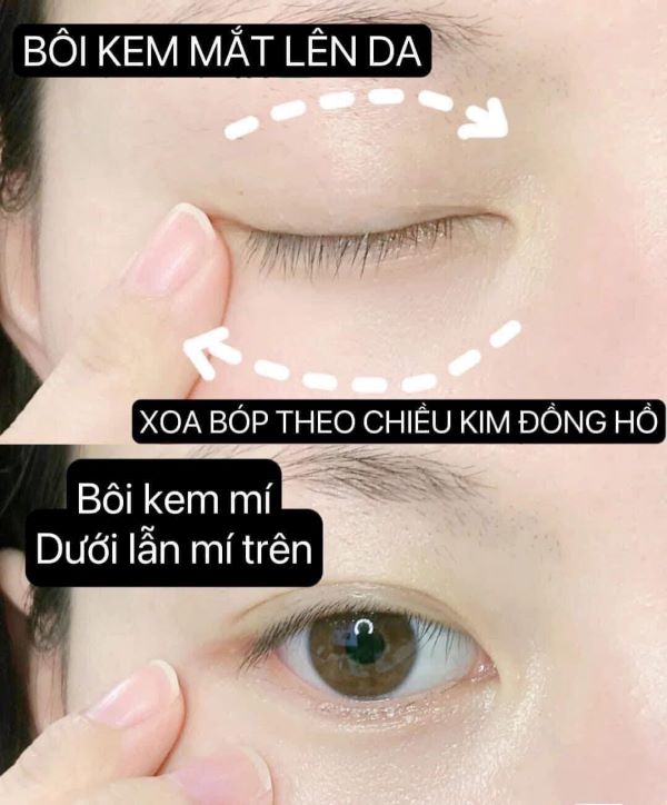 Bước 4: Thực hiện thao tác massage từ trong ra ngoài và từ dưới lên trên với lực nhẹ để kích thích lưu thông máu tại vùng da quanh mắt.